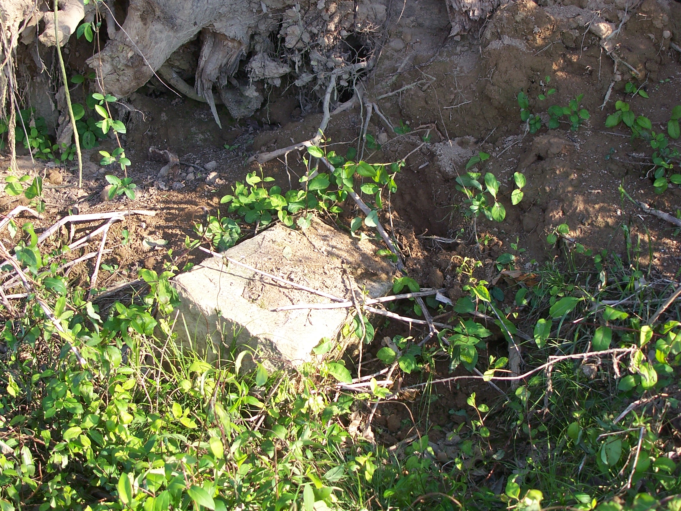 The cemetery is very overgrown, with a large tree fallen on the