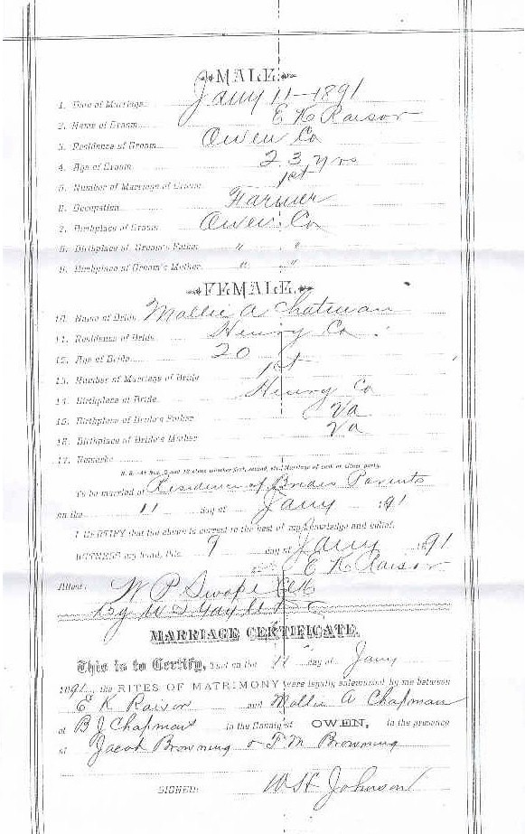 Wedding certificate of E.K. Raisor and Mollie Ann Chapman. Her parents, Beverly and Margaret Chapman, moved to Henry County from Russell County, Virginia.