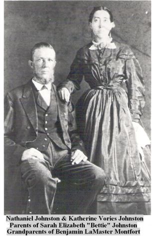 Nathaniel Johnston & Katherine Vories Johnston. Parents of Sarah Elizabeth "Bettie" Johnston. Grandparents of Benjamin LaMaster Montfort. Contributed By: Donna Stark