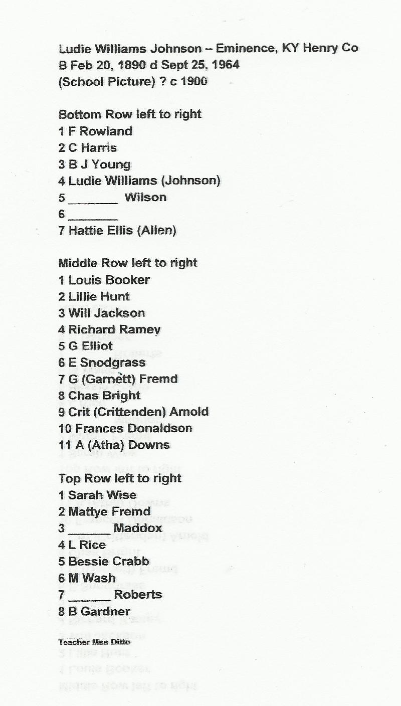 Ludie Williams Johnson (Front row middle w/ glasses) b Feb. 20, 1890. Sep. 25, 1964. Married John D. Johnson. Sister of Jay T. Williams. Buried in Eminence Cemetery. Contributed By: Great Nephew, Bill Hearn back of photo with names
