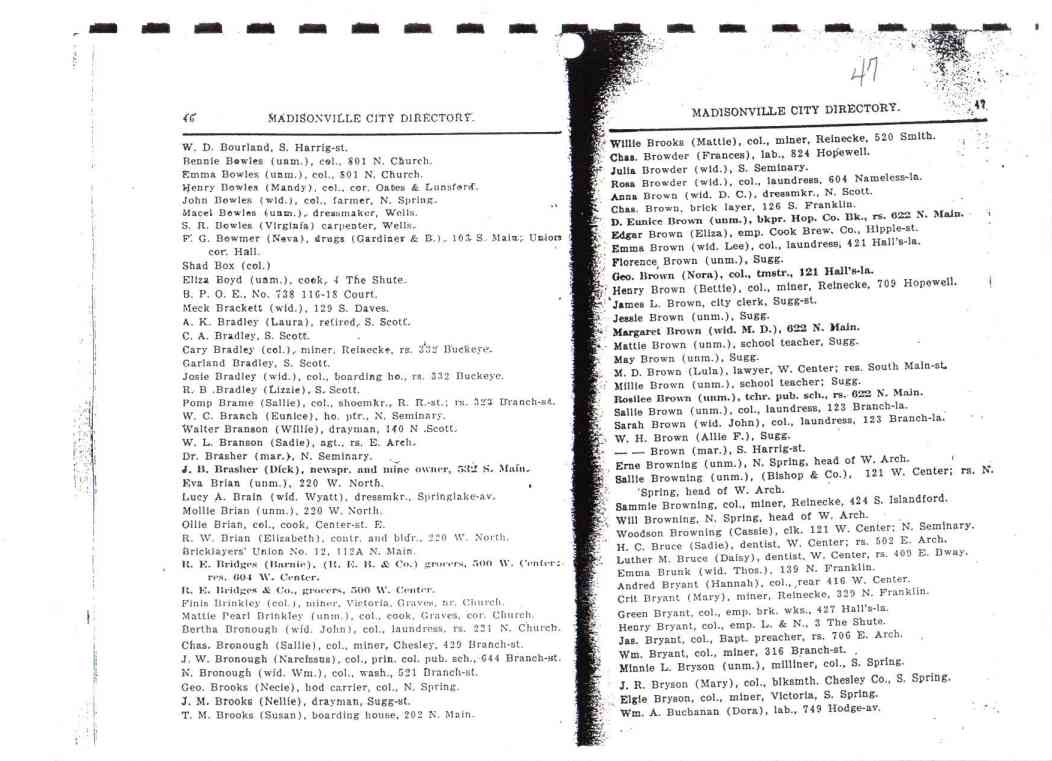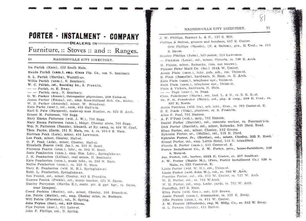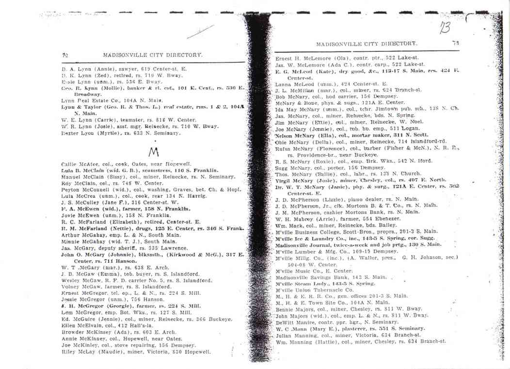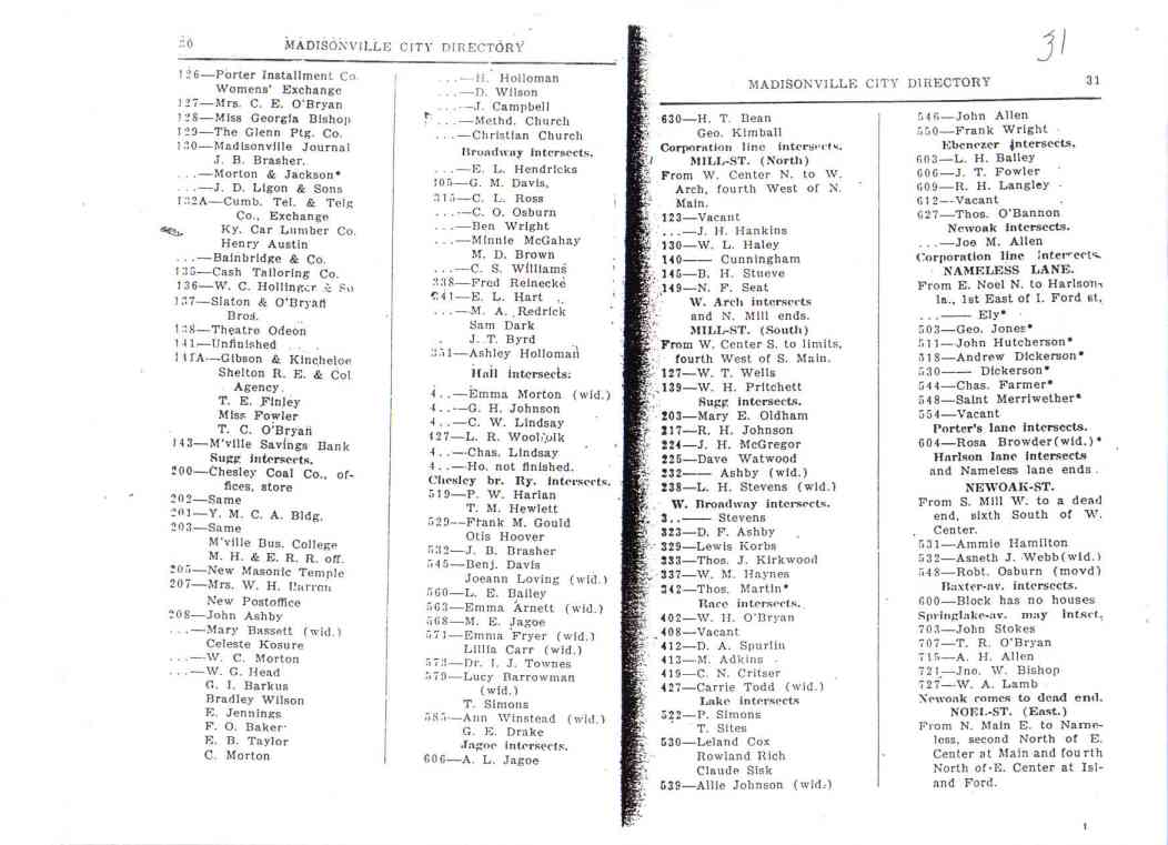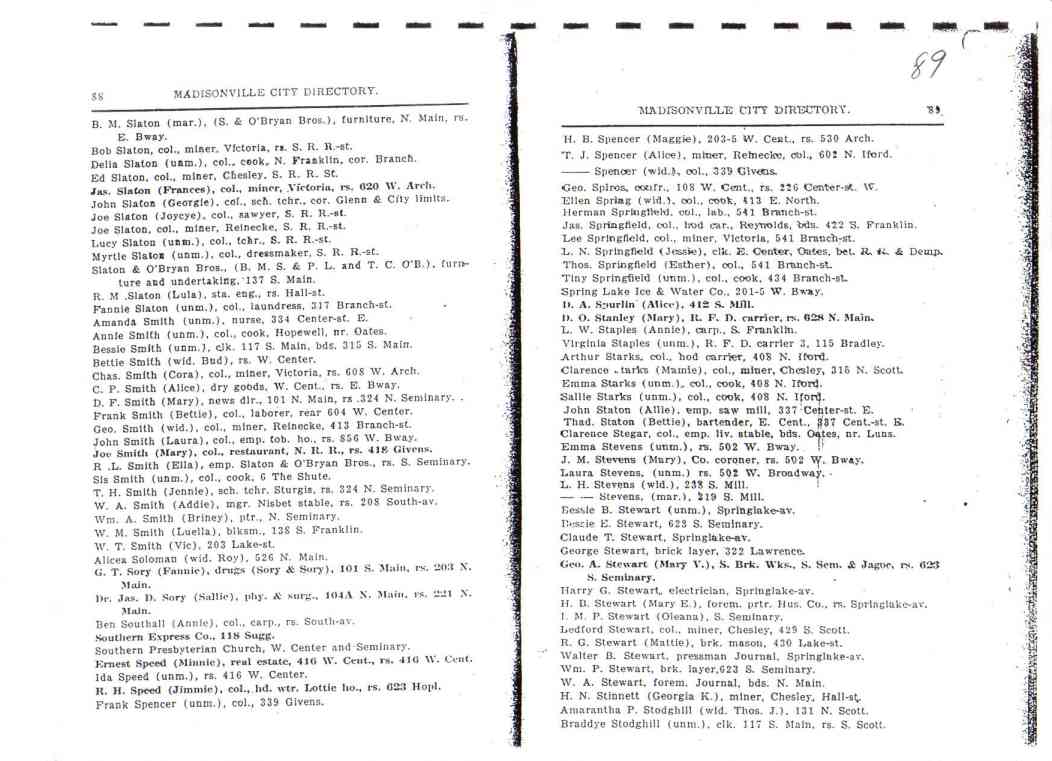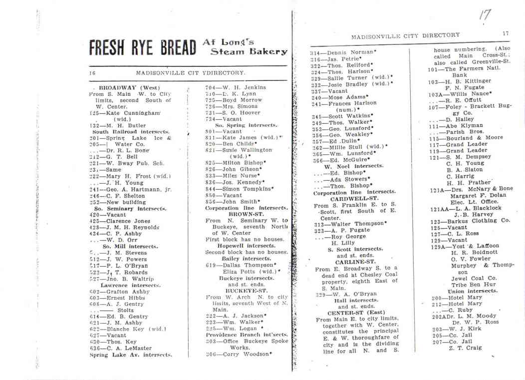 This City Directory at some time was copied and bound with a comb. As seen from the page numbers below, there are a lot of pages missing, but I thought it might be of benefit to someone anyway.