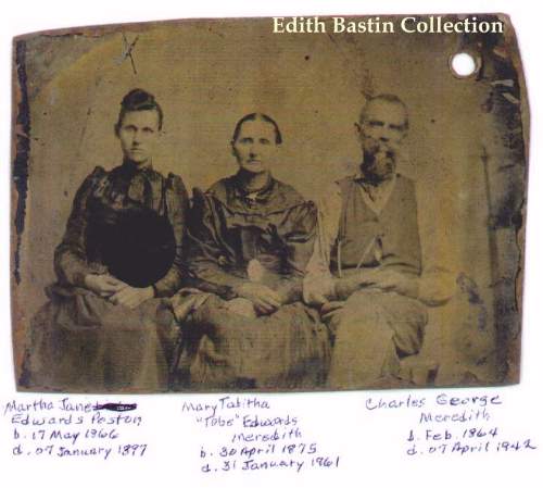 This is a copy of a tin type picture of Mary Tabitha "Tobe" Edwards Meredith with her sister, Martha Jane Edwards Poston, and with her husband, Charles George Meredith. Charles George Merideth is buried on the Ray Cardwell farm. He has a double tombstone with his wife, Mary Tabitha 'Tobe' Edwards Merideth. But Mary Tabitha 'Tobe' Edwards Merideth is buried in the Hicklin Cemetery; and she has a tombstone in Hicklin Cemetery. |