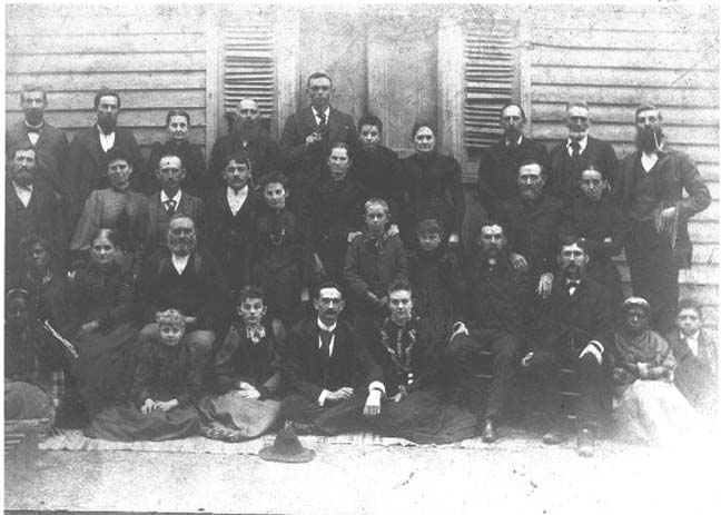 Descendants of John E. Rice (1800-1874) and Jane Martin Rice (1806-1878) of Hopkins County, at a family reunion in December, 1892 at the family homestead, south of White Plains near Mt. Carmel Church. The following are the children of John and Jane Rice: Martin Rice is second row, third from left; the woman sitting left of Martin is probably Emma Parker his wife; Nellie Rice, one of their daughters, is at Martin's feet. Third row, standing, third from left is Charles M. Rice, with his wife Irene Forman Rice second from left. Third row, standing, far right: Lewis C. Rice, with his wife Emily Ashby Rice next right, on the end. Back row, fourth from left: Bayliss Rice, with his wife Hester Stanley Bailey Rice third from left. Back row, second from right is James H Rice, with Felix W. Rice third from the right. Eliza Rice, wife of James H., is believed to be the woman standing directly in front of the tall man in the center back row. Their son, Samuel L. Rice is thought to be the young man with mustache seated on the ground in the center.