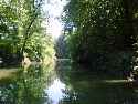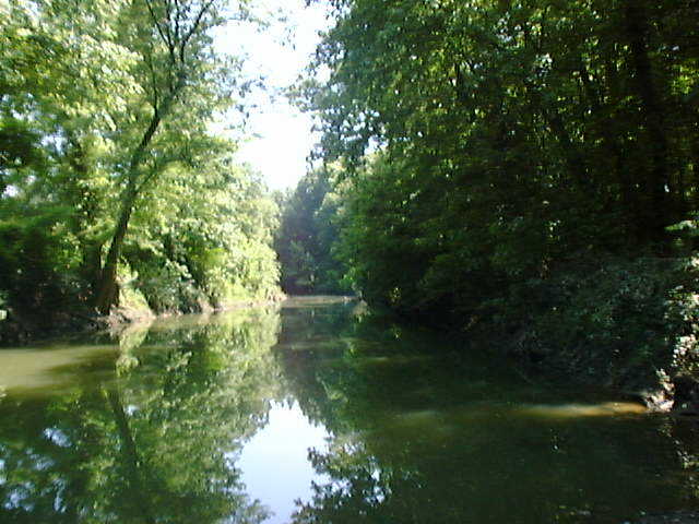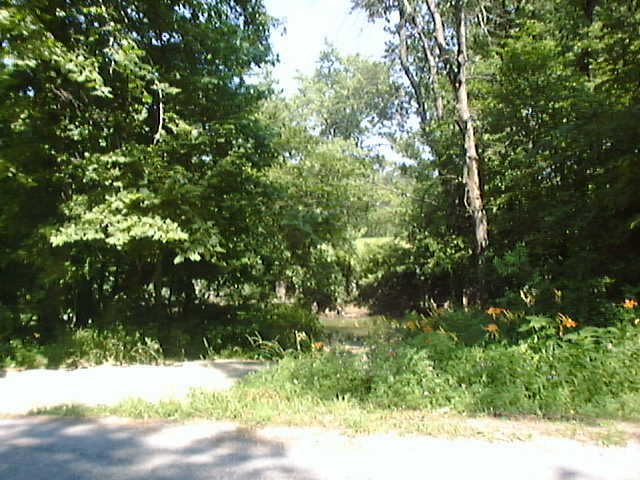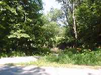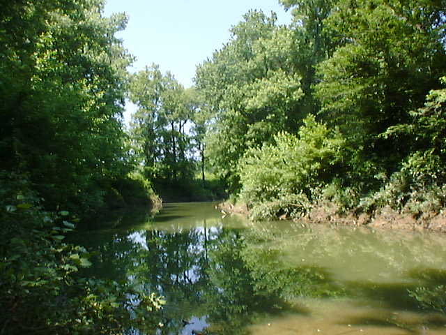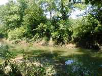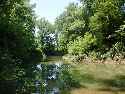 Descending around a gentle curve and hill you can see the flat "bottoms" begin almost immediately. There, on your right! You've almost missed the Cut Off! It's hard to see where the slanted descent to the bottom of the riverbank begins these days. Those same trees and underbrush are at last reclaiming the wide path that used to be here. Standing by the river now, it hardly seems fair to call this wide stream a river. The bank flattens out at the base and extends a little ways into the water creating a perfect picnic area.