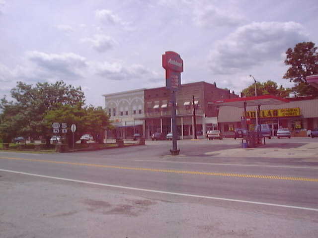 You can see Dollar General Store behind the service station. Siding was put on the end of this building and recently [early 2000] they were forced to remove the siding by the historical preservation folks. Dawson Springs just received a grant [May 2000] to revitalize much of the downtown area. I'm not sure what all that will include but sidewalks and lighting were mentioned in the paper when the grant was announced.