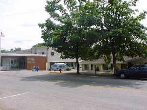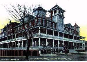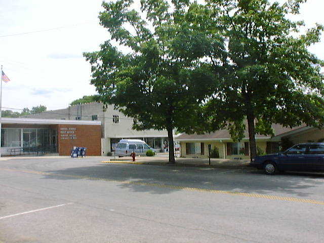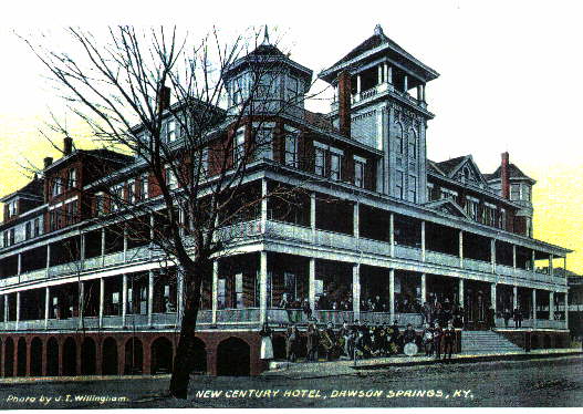 The photo on the left is the New Century Hotel, famous in its day. Today, the yellow building just behind the trees in the second photo sits on the site. This is the New Dawson Springs Nursing Home. You can also see the Post Office and the Dawson Springs Library.