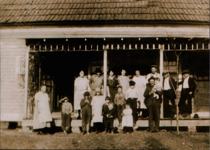 | Was taken in Jackson County on Christmas Day, 1923. On the back was written "All the Bailey's at this time, many more later" The picture shows William C. "Bill (holding grandaughter Pauline Burke) and Elizabeth "Byrd" Bailey (far left), with their family...Back row on porch, L to R, Ida "Bailey" Lakes, Elbert Bailey, Clista "Isaacs" Bailey (Elberts wife), Ethel "Bailey" Burke, Ellen "Bailey" Gabbard, Ben Gabbard Sr., Albert Bailey, Stanley Bailey...Front row L to R, James"Boyd" Bailey (hands shielding eyes), Robert Bailey, Edna Bailey, Gladys Gabbard (from Ben Gabbards 1st marriage), Ben Gabbard Jr. (in dark clothes), William "Lloyd" Bailey, Marie Burke (in white dress), Chet Gabbard (from Ben Gabbards 1st marriage)...Ethels husband William R. Burke was taking the picture...With the passing of Edna "Bailey" Meyer in January 2004, only Gladys is left from this picture. | |