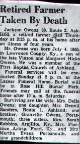 Surviving are his wife Della Owens, one daughter Mrs, Denvil Sanders Rte. 1 Ashland, one brother, Grandville Owens, Portsmouth; three sisters, Mrs. Sarah Robbins, Argillite, Ky, Mrs. Florence Astrip, Forst Ky, and Mrs Martha Evans, Portsmouth and nine grandchildren.