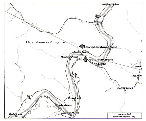 ---From memory of Elmon Davis, 1994, Flat Gap, Ky. Great Uncle Elmon asked me if I knew how Joe Davis Bend got his name, and I replied I just suspected it was because he lived there. Elmon replied" Old Joe had land on both sides of the river there, you see, and he fell out of his boat one day while crossing and fell in the river. He was drinkin' and about drowned " He continued on telling about how the men drank so much more in times past than they do now.
