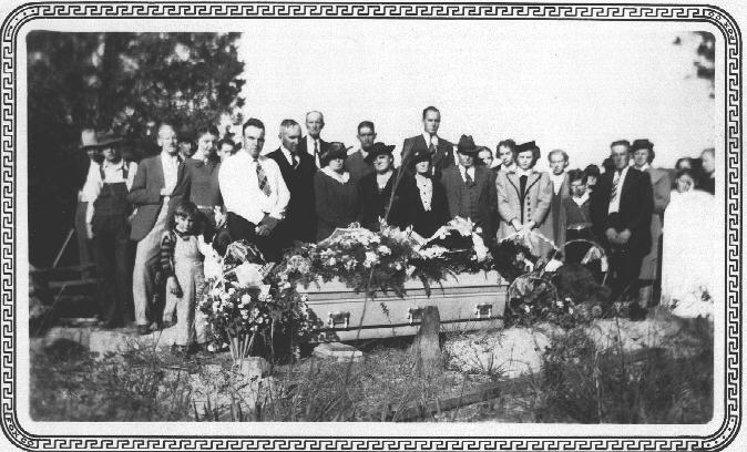 This was probably the burial of Rosa Mahessatine "Hessie" (Davis) Pack (1868-1940), daughter of John Buell Davis and Larue B. Nickell, and wife of Leander "Lee" Pack (1861-1932), son of Allen and Perlina (Chandler) Pack. Identified so far are Buell Pack, son of Lee and Hessie. Buell's wife Georgie (Ramey) Pack and children Bobby and June Pack. Also identified; my g-grandfather Millard Albrittion "Britton" Davis, brother of Hessie, and Bertha (Pack) Sparks (wife of John) In another photo, other attendents were: John Davis, Henry Bishop, wife and child, Laura Harris Slone (dau of David George Washington Harris), Cora Slone, Mandy Wheeler and Franklin Wheeler.