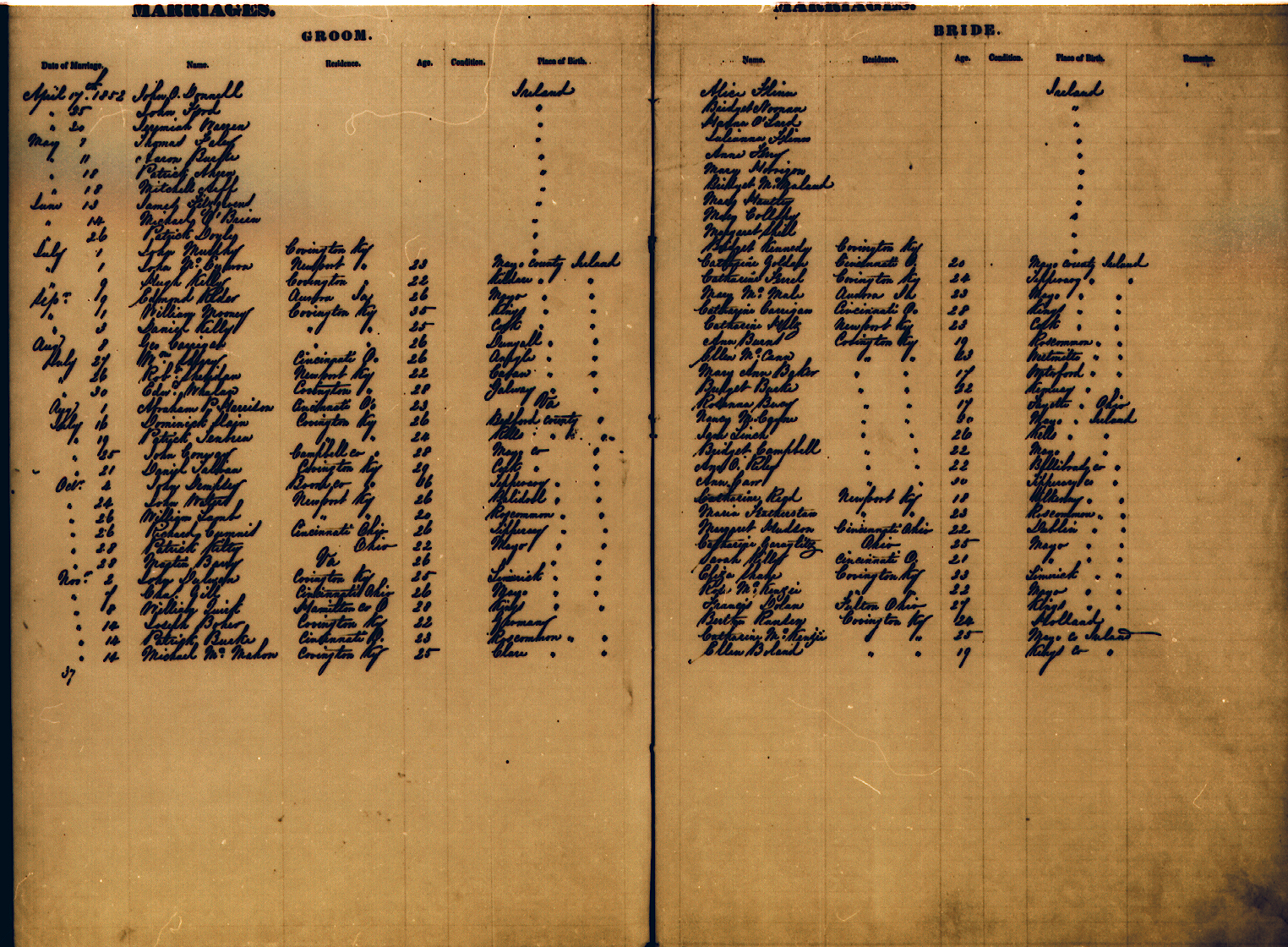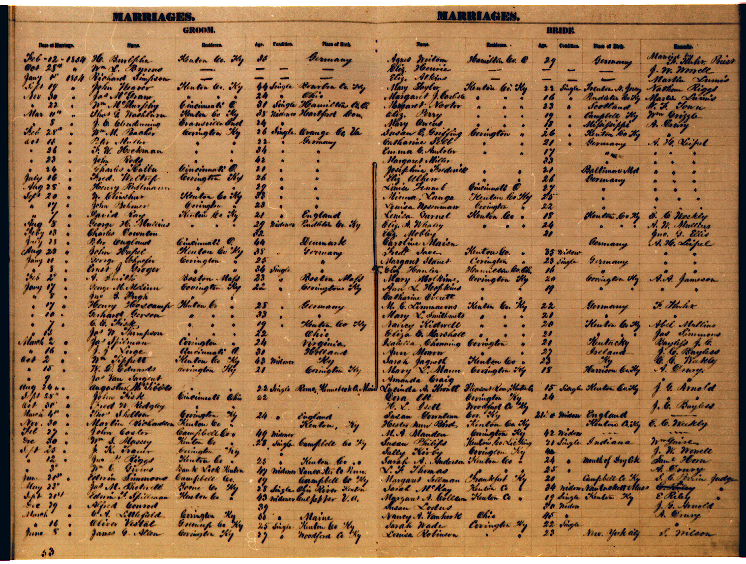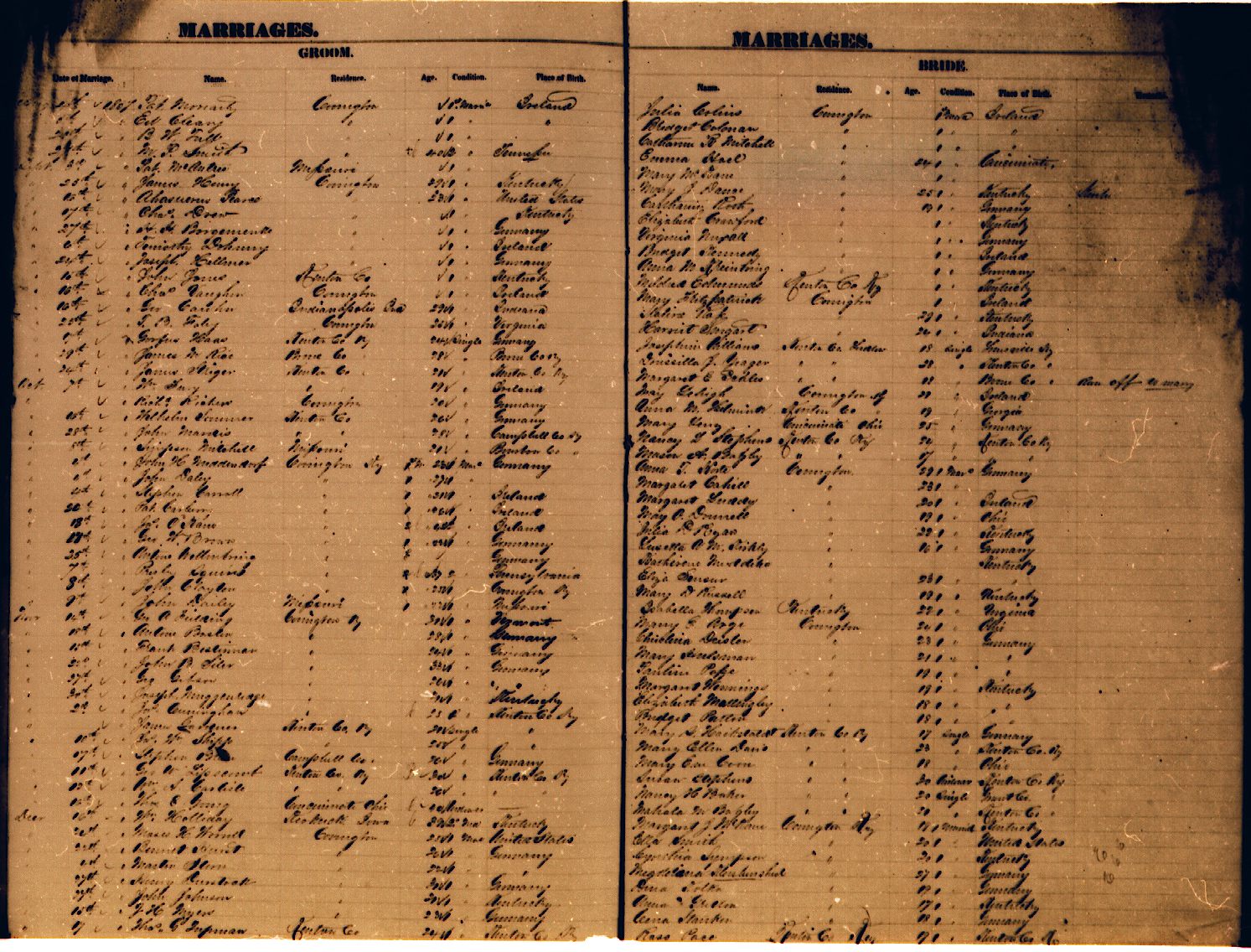 Kenton County has two locations for the recording of marriages, Covington and Independence. Independence started recording marriages in 1840 and Covington in 1874. Many of the early Independence records are now housed in Covington (see the table below); others are in the Kentucky archives in Frankfort, particularly the "loose papers".