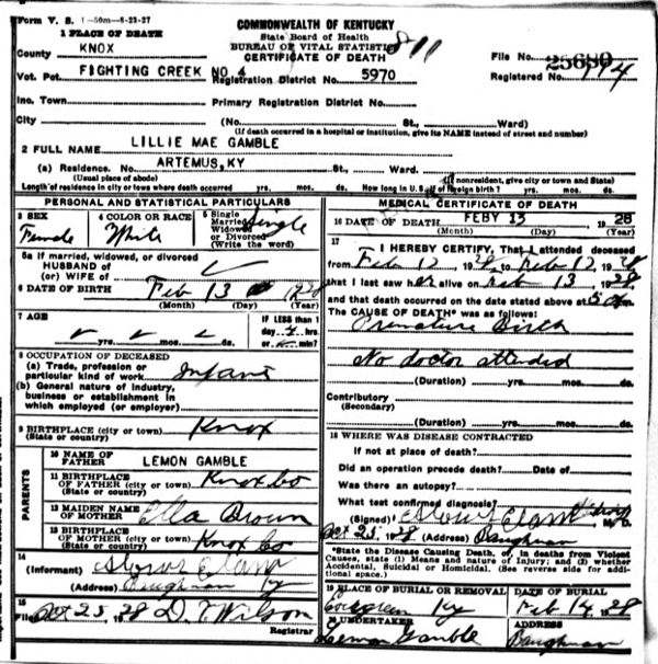 Death Certificate Donated by Lori Gambrel, Lillie is Lori's halfsister.