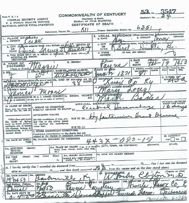 This death certificate was graciously donated by Wanda O'Bryan