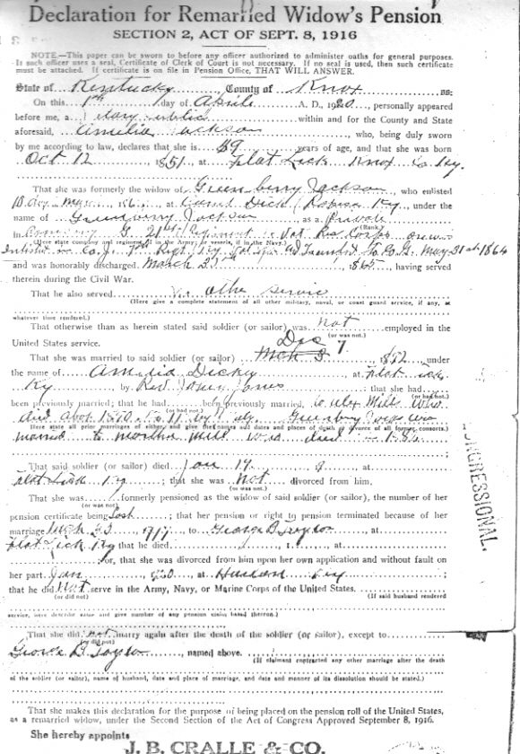 Amelia Dickey Jackson's widow Partial Pension File donated by Randy Jackson