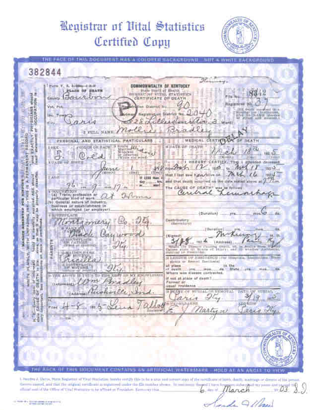 | Submitter: Lora Hutsell Washington Death Volume: 1925 Certificate Number: 08342 Surname: BRADLEY Given Name: Mollie Date of Death: 18 March 1925 Place of Death: Paris, Bourbon Co., KY Race or Color: Col'd Sex: F Marital Status: Widow Spouse's Name: Spouse's Age: Cause of Death: Cerebral Hemorrhage Place of Burial: Paris, KY Residence: 828 Lillestone Ave. Occupation: at Home Date of Birth: 1 June 1848 Age: 76 Birth Place: Montgomery Co., KY Father's Name: Hack Caywood Father's Birth Place: Mother's Name: Priscilla --------- Mother's Birth Place: KY Informant: Wm Bradley Comments and Corrections: See Cedar Heights Cemetery See also Descendants of William Bradley