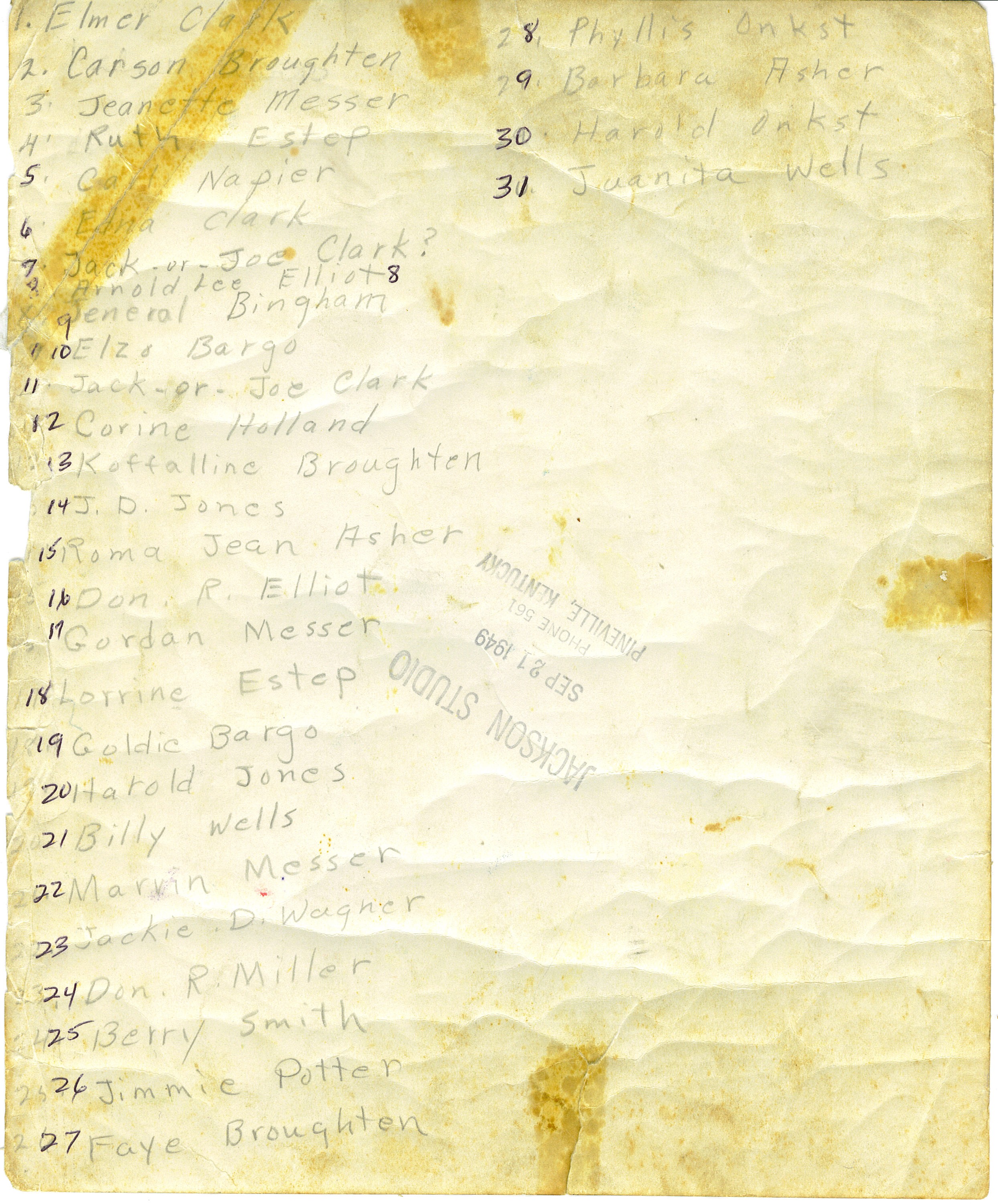 Onkst; 29. Barbara Asher; 30. Harold Onkst;