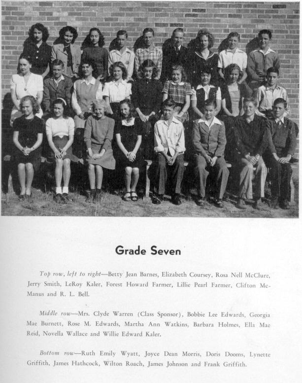 Top Row, left to right -- Betty Jean Barnes, Elizabeth Coursey, Rosa Nell McClure, Jerry Smith, LeRoy Kaler, Forest Haward Farmer, Lillie Pearl Farmer, Clifton McManus, and R.L. Bell