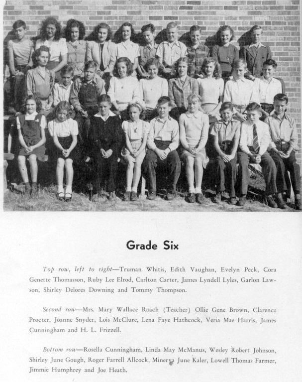 Middle Row -- Mrs. Mary Wallace Roach (Teacher), Ollie Gene Brown, Clarence Procter, Joanne Snyder, Lois McClure, Lena Faye Hathcock, Veria Mae Harris, James Cunningham, and H.L. Frizzell.