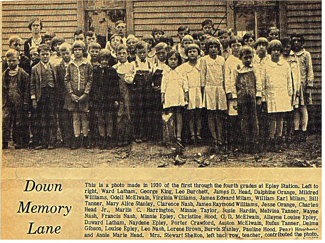 - Epley Station School 1930 Submitted by Mary Latham This is a photo made in 1930 of the first through the fourth grades at Epley Station. Left to right, Ward Latham, George King, Leo Burchett, James D. Head, Dalphine Orange, Mildred Williams, Odell McElwain, Virginia Williams, James Edward Milam, William Earl Milam, Bill Tanner, Mary Alice Stanley, Clarence Nash, James Rayaond Williams, Jesse Orange, Charles Head Jr., Marlin C. Harrington, Minnie Taylor, Susie Hardin, Melvina Tanner, Wayne Nash, Francis Nash, Minnie Epley, Christine Hood, O. D. McElwain, Alleyne Louise Epley, Duward Latham, Naydene Epley, Porter Crawford, Auston McElwain, Rufus Tanner, Delma Gibson, Louise Epley, Leo Nash, Lorene Brown, Burvln Stanley, Pauline Hood Pearl Houchens? and Annie Marie Head. Mrs. Stewart Shelton, left back row, teacher, contributed the photo