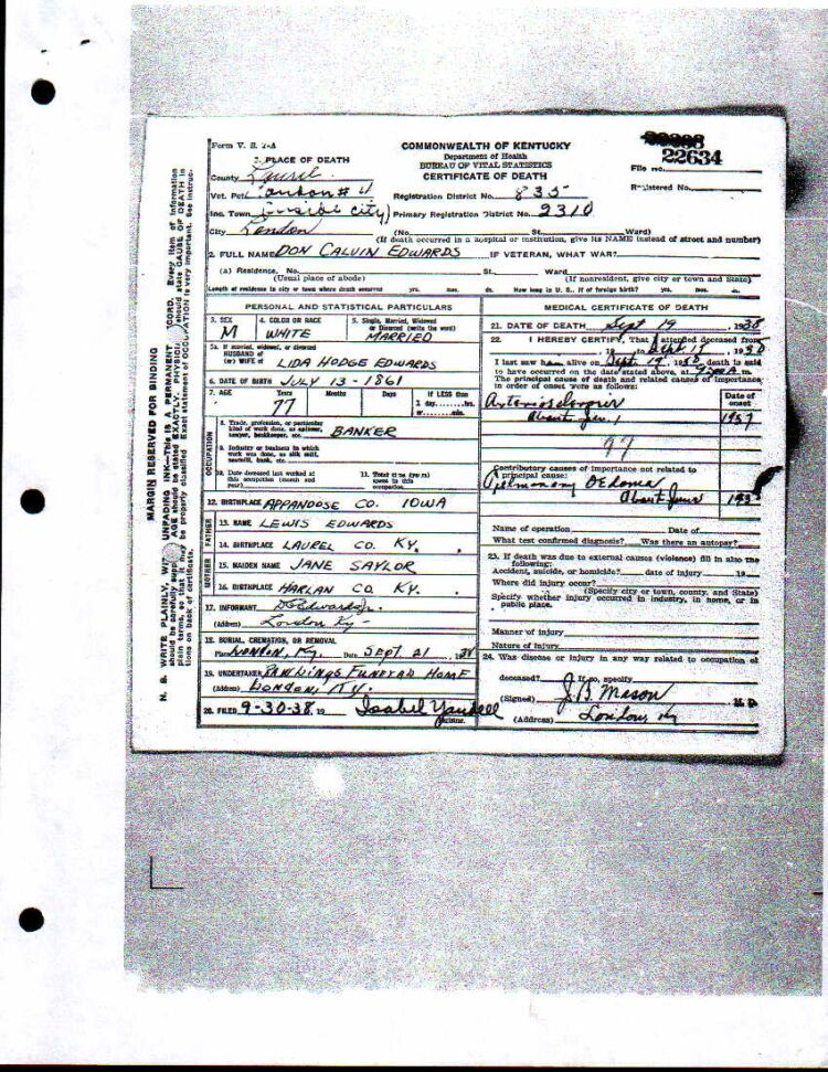 Submitted by Tami Erskine September 10, 2001 Don Calvin Edwards was the son of Lewis Edwards & Jane Saylor.
