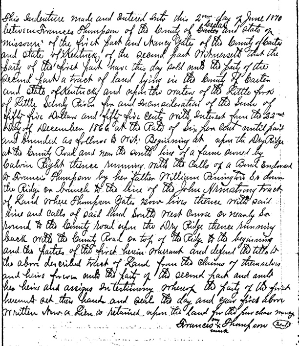This deed was contributed by Gerry Penberthy. There are several Lawrence County people named in the deed although it is a deed for land in Carter Co., KY. Some of the names are Thompson, Yates and Pennington.