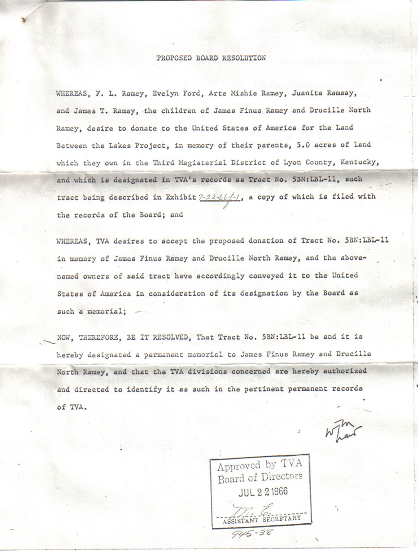 TVA Land Gift as Memorial To Parents Generously Donated by Ken Ramsay Return to Ramey Collection Home