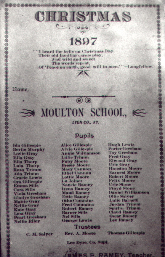 This was a Christmas Card from the teacher of Moulton School in Lyon County, KY in 1897, James E. Ramey. It is provided by Rick Thorpe