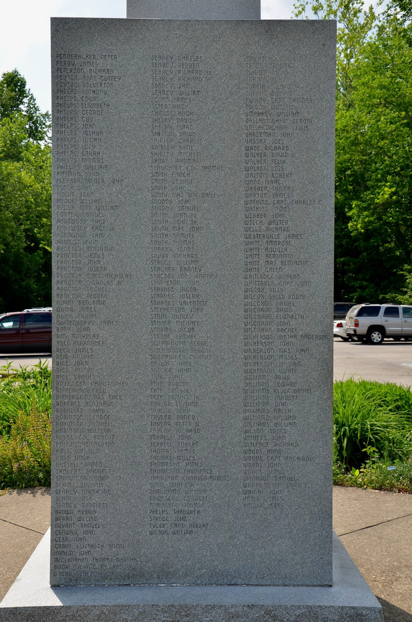 Peter PENNYBACKER, James PERRY, Richard PETERSON, Anny Duffey PEYTON, Yelverton PEYTON, Anthony PHELPS, Edwin PHELPS, Elizabeth PHELPS, George PHELPS, Guy PHELPS, John PHELPS, Joshua PHELPS, Josiah PHELPS, Lucy PHELPS, Sarah PHELPS, Thomas PHELPS, William PHILLIPS, John PITTMAN, John PLEAKENSTALVER, John PLECK, John POGUE, William POGUE, Mrs. William POGUE, Samuel PORTER, Page PORTWOOD, Sam PORTWOOD, Levin POWELL, James PROCTOR, John PROCTOR, Joseph PROCTOR, Capt. Nicholas PROCTOR, Nicholas PROCTOR Jr., Rachel PROCTOR, Reuben PROCTOR, James QUISENBERRY, Benjamin QUINN, James QUINN, Thomas QUINN, John RANK, Nicholas RAY, Alexander REED, JOhn RICE, Joseph RICE, Samuel RICE, Benejamin ROBERTS, Davidn ROBINSON, George ROBINSON, Samuel ROBINSON, William ROBINSON, Col. Robert RHODES, Pemberton ROLLINS, Ambrose ROSS, Hugh ROSS, Gen. Christopher RIFFE, Fred RIPPERDAM, Mrs. Fred RIPPERDAM, James RUSSELL, Samuel SANDERS, John SAPPINGTON, William SCHOLL, Anderson SEARCY, Asa SEARCY, Bartlett SEARCY, Charles SEARCY, Reuben SEARCY, Richard SEARCY Jr., Richard SEARCY Sr.,. Samuel SEARCY, William SEARCY, James SCOTT, Hugh SEFER, Hugh SHIELDS, David SHELBY, Isaac SHELBY, David SHELTON, Charles SHIRLEY, Katie SHIRLEY, Michael SHIRLEY, Thomas SHORES, Col. Thomas SLAUGHTER, Enoch SMITH, Encoh George SMITH, John SMITH, Maj. William Bailey SMITH, John SNODDY, Samuel SNODDY, John SOUTH Jr., John SOUTH Sr., Mrs. John SOUTH, Samuel SOUTH, Thomas SOUTH, Richard SPURR, William STAGG, Barney STAGNER, John STAPLETON, Jacob STARNES, Joseph STARNES, Jacob STEARNS, John STEPHENSON, Dudley STONE, Michael STONER, Samuel STRODE, Berue SWEARINGEN, Benoni SWEARINGEN, Thomas SWEARINGEN, Hale TALBOTT, John TANNER, John TATE, Robert TATE, Samuel TATE, Edmond TAYLOR, John TAYLOR, Nancy TAYLOR, Peter W. TAYLOR, Richard TAYLOR, John TERRELL, Robert TERRELL, James THOMAS, Moses THOMAS, James THOMPSON, Lawrence THOMPSON, Col. John TODD, William TOMLINSON, Gerrett TOWNSEND, Joshual TOWNSEND, Oswald TOWNSEND, Thomas TRIBBLE, David TURNER, John TURNER, Solomon TURPIN, William TURPIN, Capt. Thomas TWIDDY, William TWIDDY, William UMPHREY, Benoni VALLANDIGHAM, Lewis VALLANDIGHAM, Joel VASSAR, Richard WADE, Joel WALKER, Isaac WANE, David V. WALKER, Felix WALKER, Robert WALTON, Thomas WARREN, James WARTON, Capt. Charles G. WATKINS, James WATKINS, John WEBBER, Walter WELCH, Richard WELLS, Ambrose WHITE, Aquilla WHITE, Galen WHITE, Robert WHITLEDGE, Capt. John WHITTAKER, Billy WILCOX, Sally Boone WILCOX, Daniel WILCOXON, Elizabeth WILCOXON, John WILCOXON, Rachel WILCOXON, Aletha Anderson WILKERSON, John WILKERSON, Mrs. John WILKERSON, Moses WILKERSON, Wyatt WILKERSON, William WILLIAMS, Edward WILLIAMS, Jarrett WILLIAMS, John WILLIAMS, Richard WITLEDGE, Moses WILSON, Adams WOODS, Capt. Archibald WOODS, John WOODS, Samuel WOODS, Samuel WOODSON, Capt. Edward WORTHINGTON, John WRIGHT, James WESTERVELDT (Westerfield), John WITHERS, James YATES, Jesse YOCUM