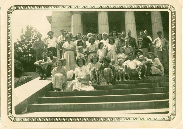 Found this picture in Mama's pictures. I remember her saying it was "our church group that went to Abe Lincoln's birthplace." Back of picture is stamped "August 1950" by Kodak. My dad is on the very back row, last one on right. Mama is between the 2nd and 3rd columns on the building, with a part in her hair, and Billy my brother is at her elbow. I am the 2nd girl to the left of Billy. We think Doris Mitchell and Elsie Keith (to Doris' right) are on the front row with their knees pulled up. My mother was Christine Hubbard before she married William Robert Garmon. I don't know if this is the Foundation Methodist Church or the Sulphur Well Baptist Church, or it might even be Pink Ridge, but I don't think it is Pink Ridge. Any help identifiying the church & these people would be greatly appreciated!