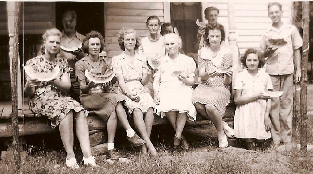 From left to right is Inis Garrett (sister of Carl Garrett), Bertha Hurt, Hettie Hurt Thurman, her mother, Elizabeth Johnson Hurt, Elizabeth's daughter Della Rae Hurt Garrett, and behind her is her husband Carl Garrett, then Thelma Thurman. The date on the photo is 1946.