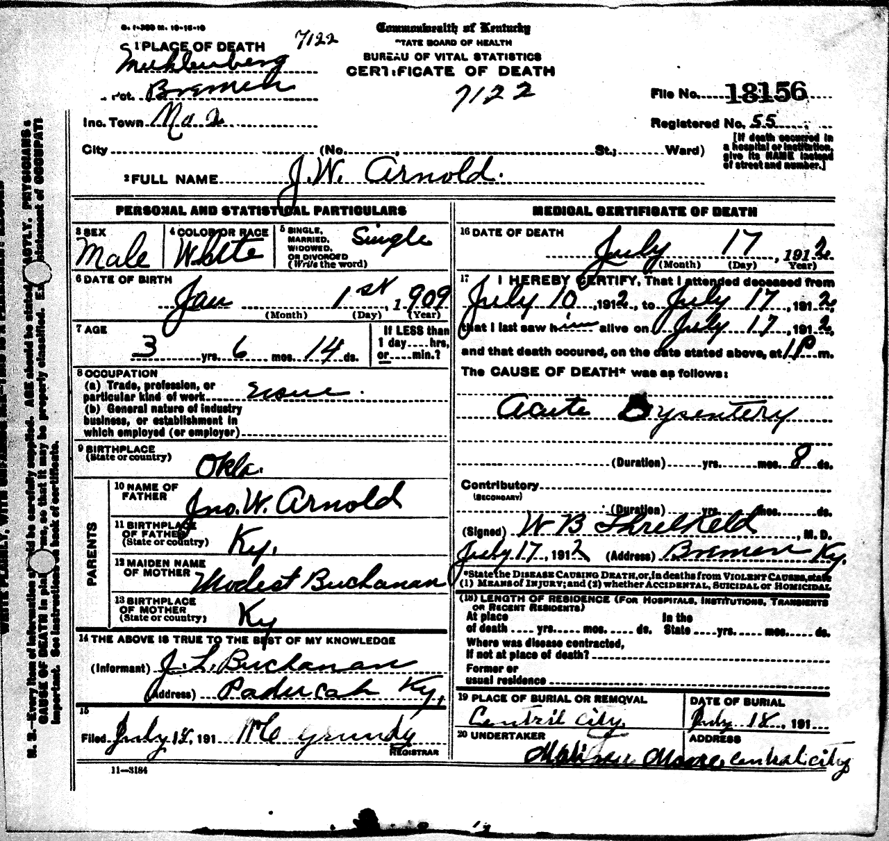 - Arnold, J.W. Born 31 Jan 1909. Died 17 July 1912. Son of J.W. & M.L. Arnold.