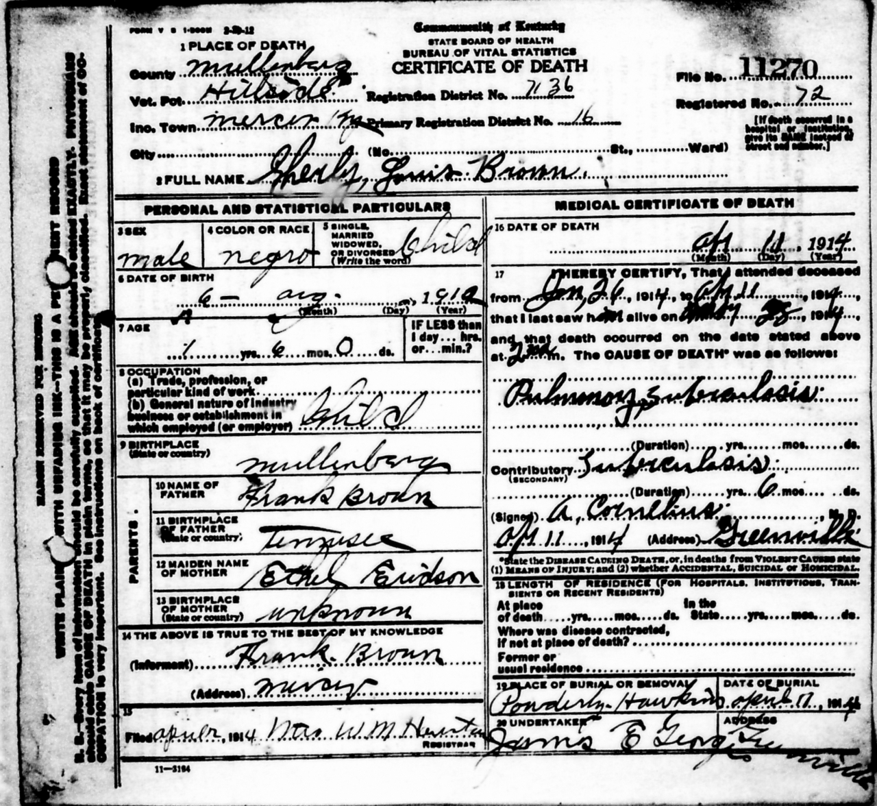 - Brown, Sherly Louis. Born 6 Aug 1912. Died 11 Apr 1914. Son of Frank Brown & Ethel Eridson.