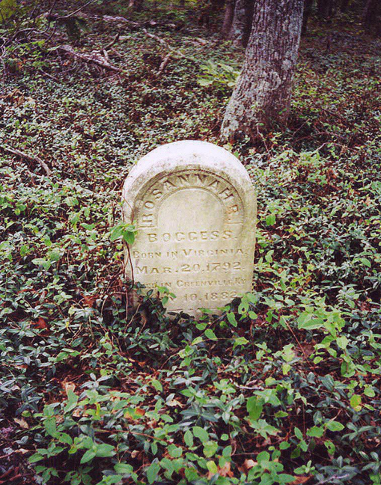 | Boggess16 | Rosannah R. | 20 Mar 1792 | 10 July 1882 | Inscription: Born in Virginia, died in Greenville, Ky. Daughter of Richard D. Reynolds17 & Nancy Grisham18. Rosanna Reynolds married Robert Boggess 6 Feb 1809 in Muhlenberg County19. | Gravestone of Rosannah Boggess |
