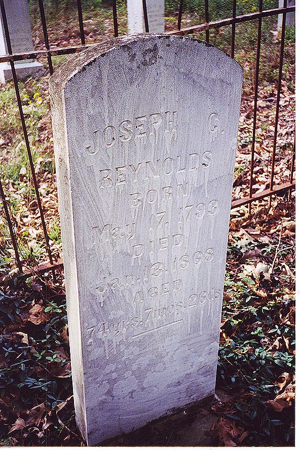 | Reynolds164 | Joseph C. | 17 May 1793 | 13 Jan 1868 | Inscription: Aged 74 yrs. 7 mos. 26 ds. Joseph Chatten Reynolds, son of Joseph & Frances Reynolds165. Joseph Reynolds Jr. married Polly Reynolds 30 Jan 1820 in Muhlenberg County166. | Gravestone of Joseph Reynolds |