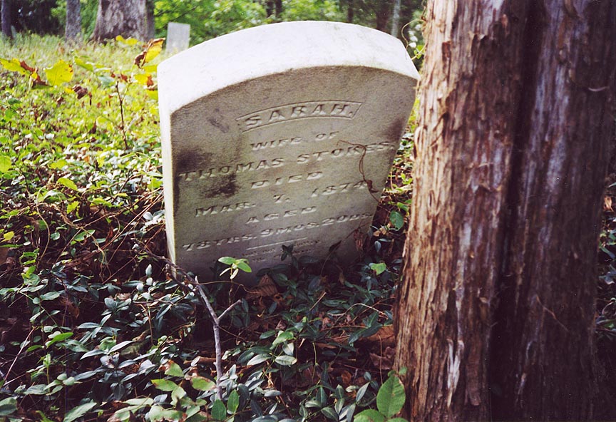 | Stokes211 | Sarah | 7 Mar 1874 | Inscription: Wife of Thomas Stokes. Died aged 78 yrs. 9 mos. 20 ds. Sarah Reynolds married Philip Anthony; he died in 1817. Sarah then married Thomas Stokes in 1820 in Hopkins County, Kentucky. She is the daughter of Joseph Chattin Reynolds & Frances [unknown].212. | Gravestone of Sarah Stokes | |
