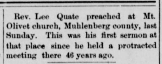 Rev. Lee Quate preached at Mt. Olivet church, Muhlenberg county, last Sunday. This was his first sermon at that place since he held a protracted meeting there 46 years ago.