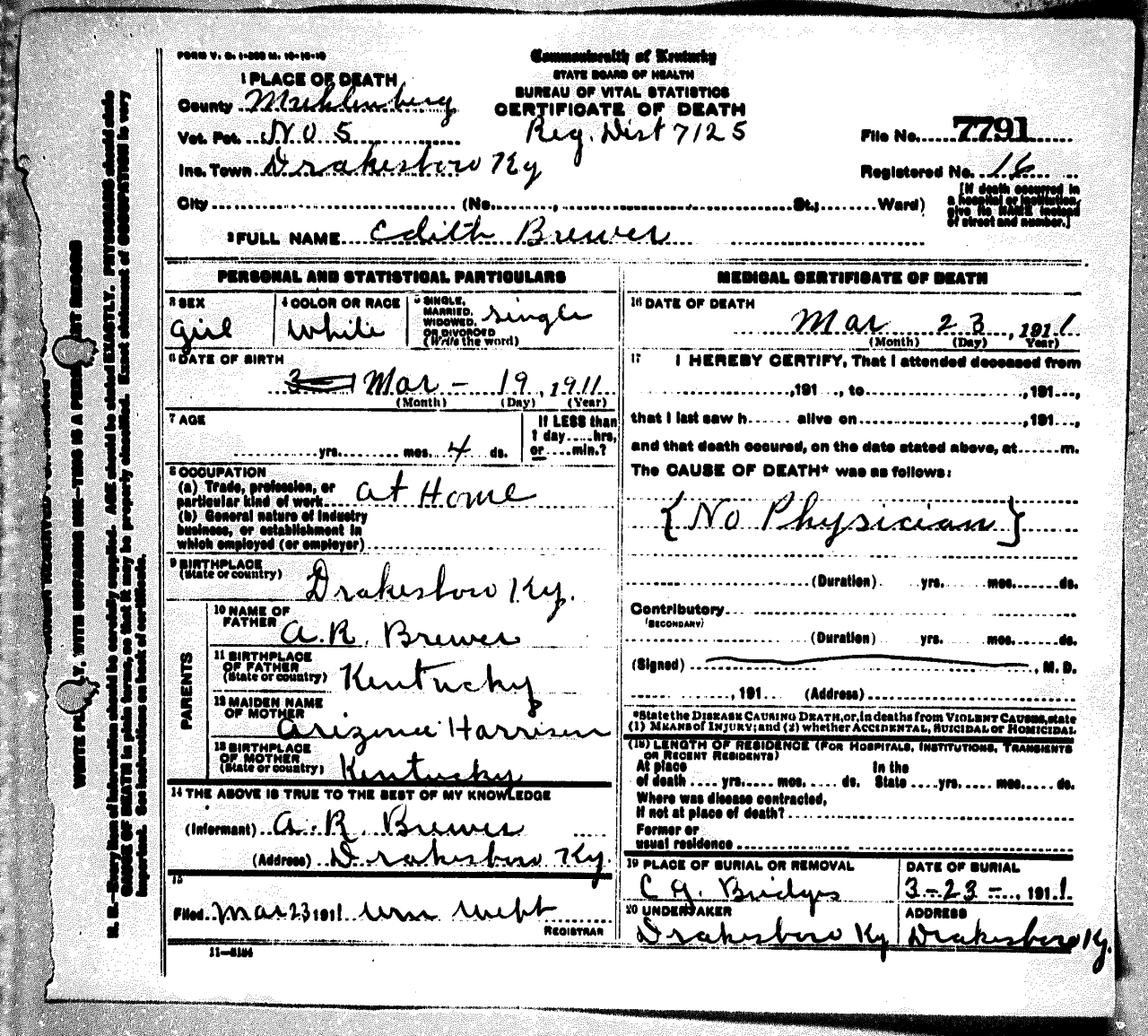 - Brewer, Edith (1911 - 1911) Kentucky Death Certificate 7791.