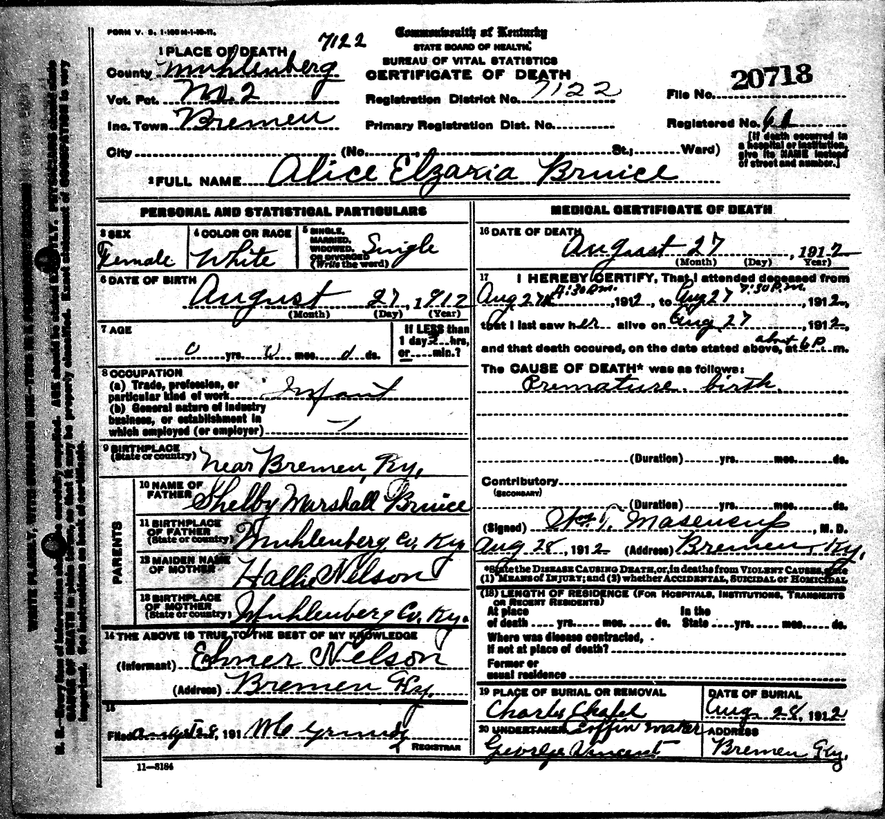 - Bruice, Alice Elzaria (1912 - 1912) Kentucky Death Certificate 20718.
