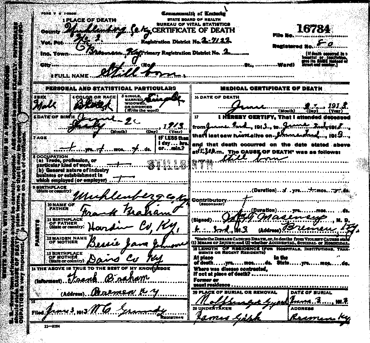 - Braham, unnamed (1913 - 1913) Kentucky Death Certificate 16784.