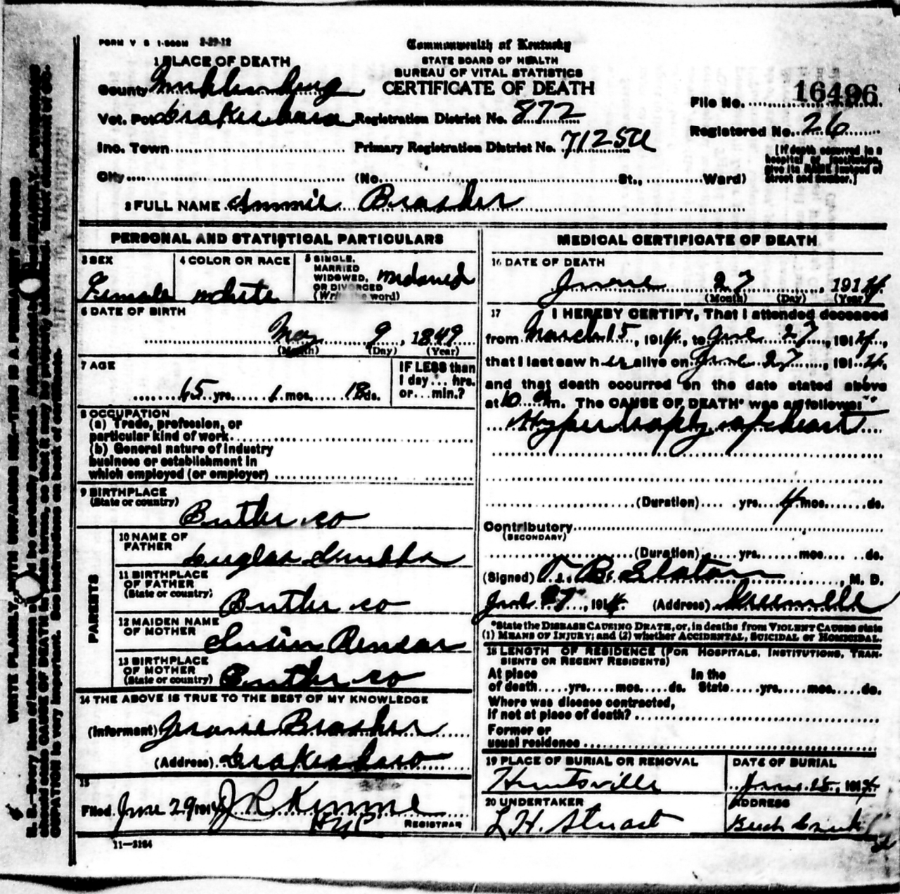 - Brasher, Ammie (1849 - 1914) Kentucky Death Certificate 16496.