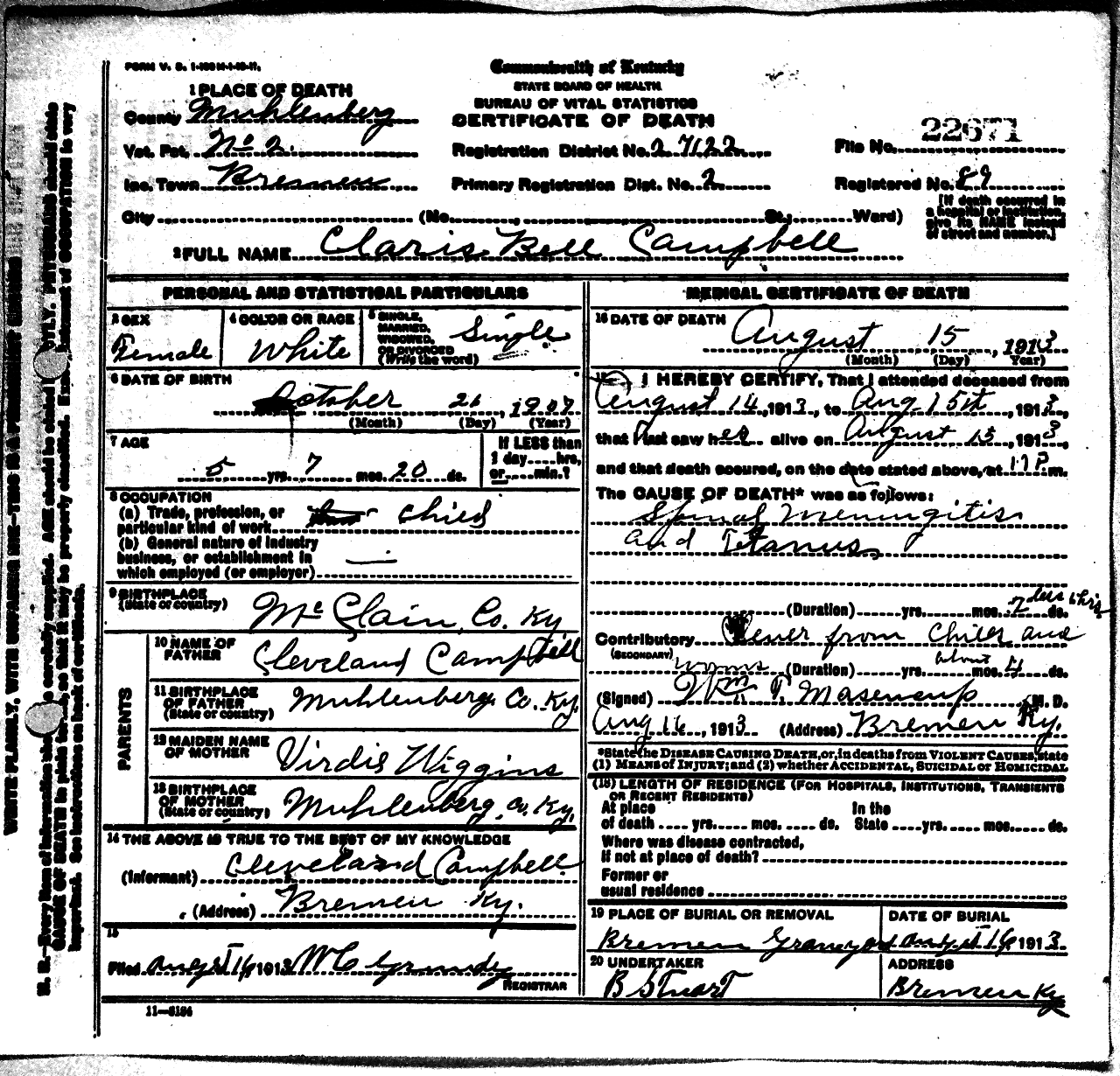 Kentucky Death Certificate 22671.