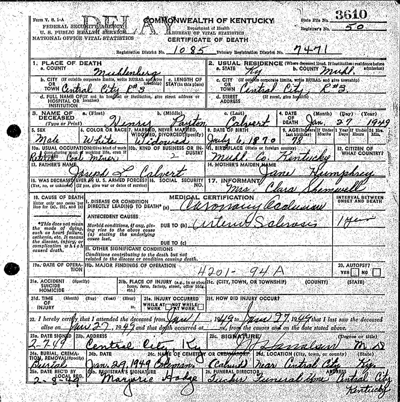 Kentucky Death Certificate 3610.