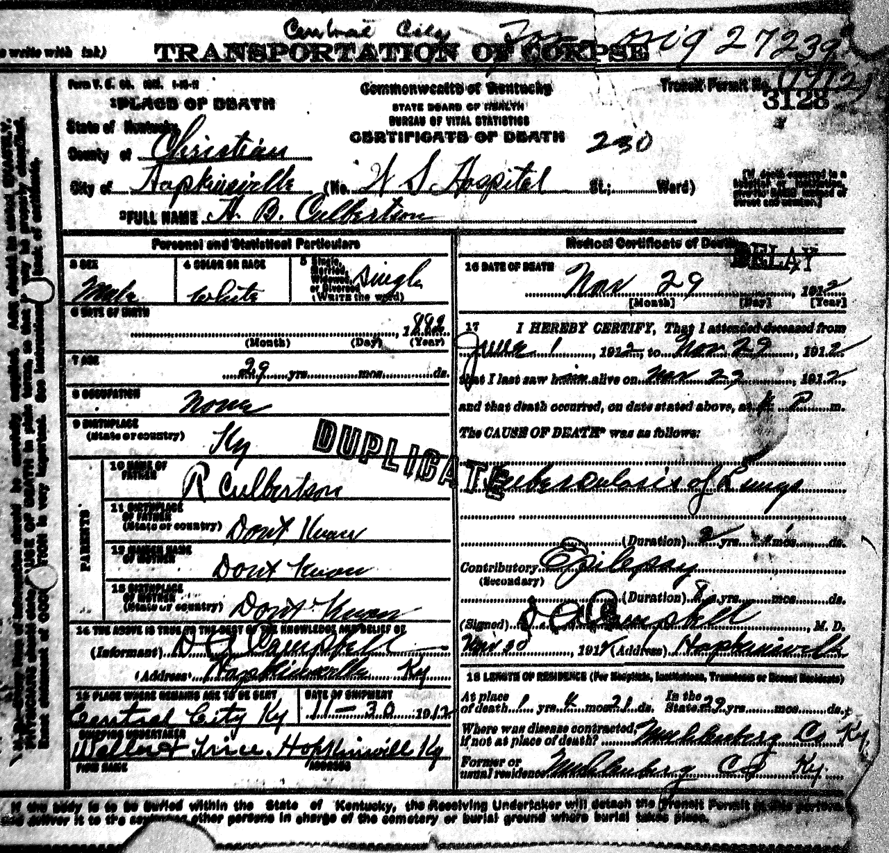 - Culbertson, H.B. (1882 - 1912) Kentucky Death Certificate 3128.