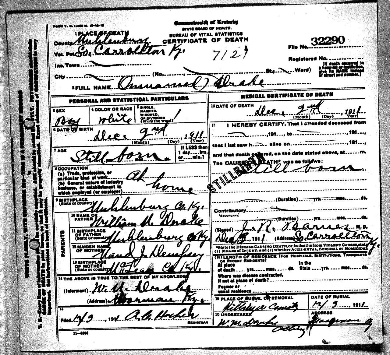 - Drake, unnamed (1911 - 1911) Kentucky Death Certificate 32290.