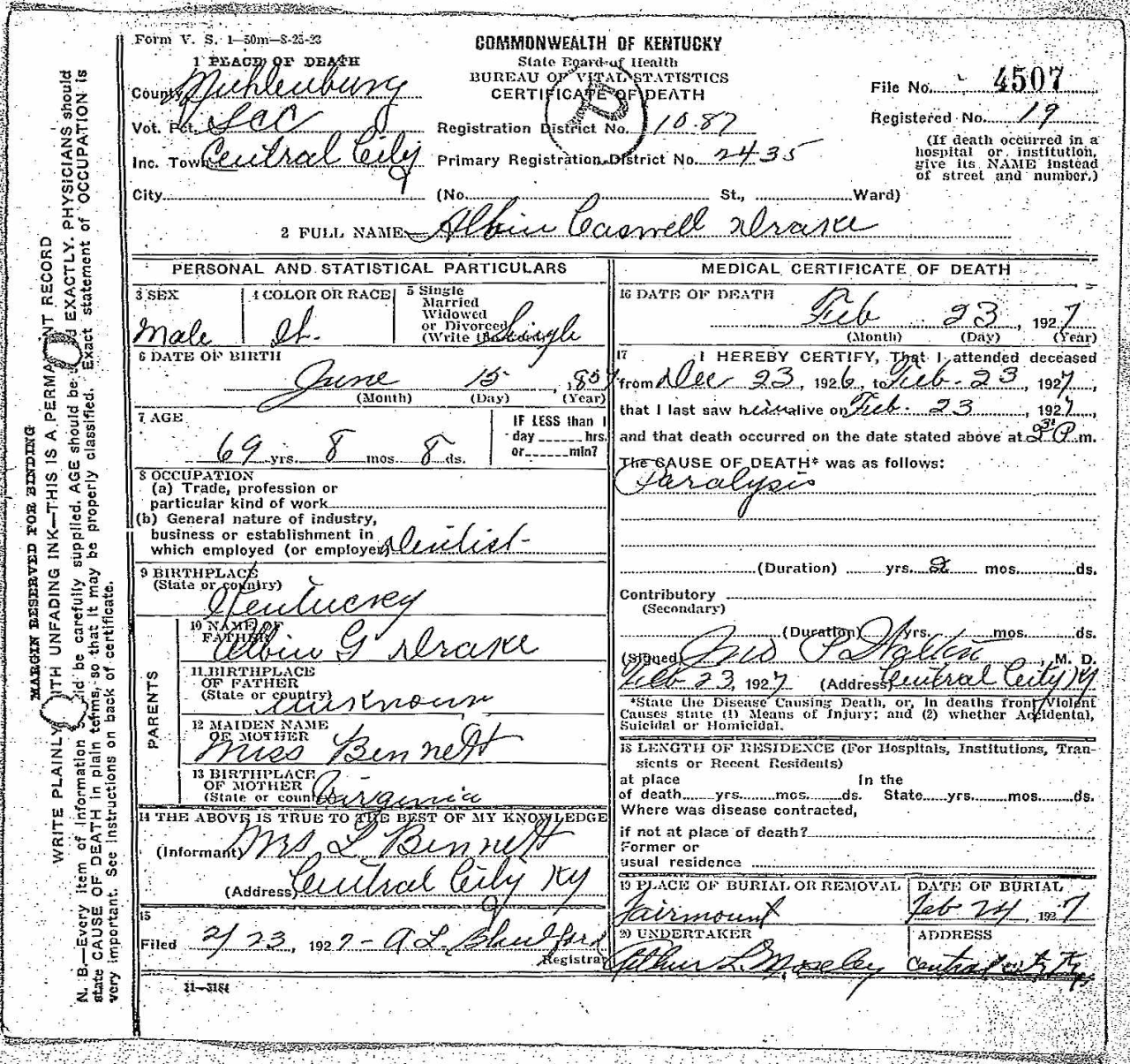 - Drake, Albin Caswell (1857 - 1927) Kentucky Death Certificate 4507.