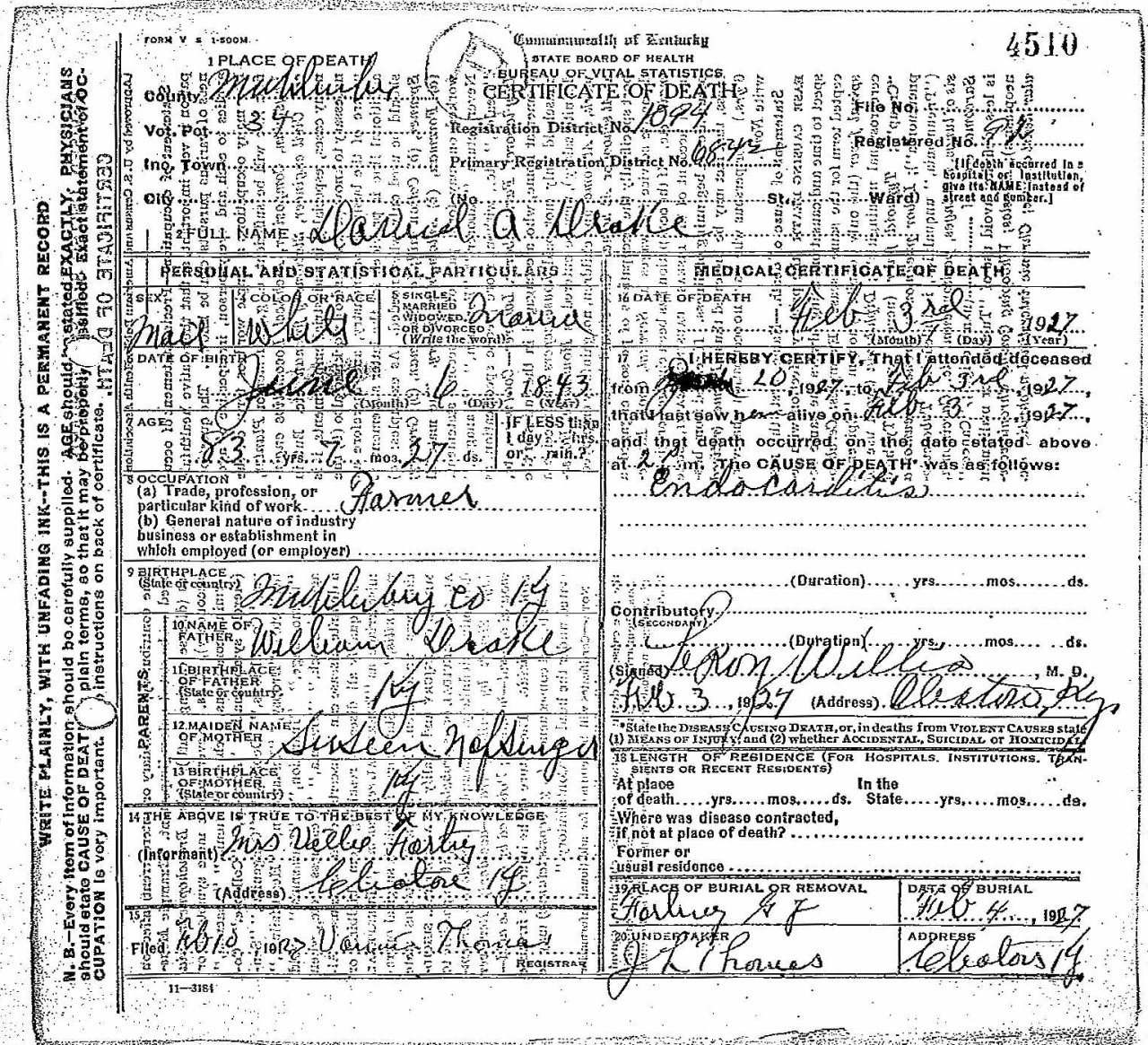- Drake, David A. (1843 - 1927) Kentucky Death Certificate 4510.