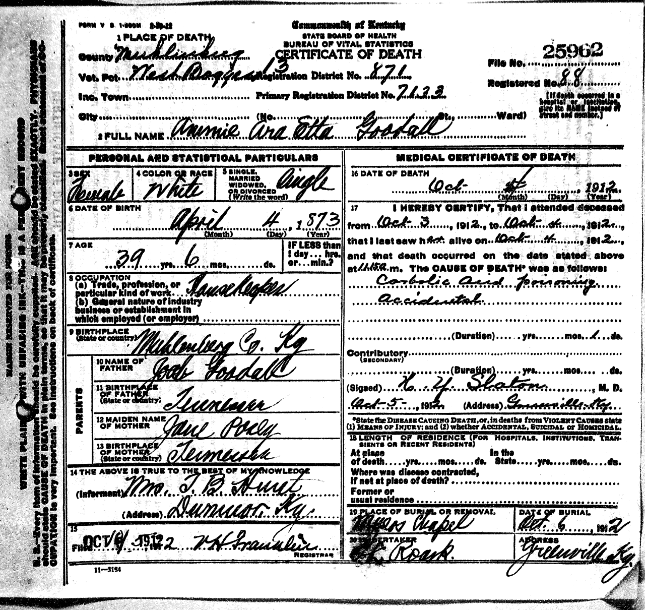- Goodall, Ammie Ara Etta (1873 - 1912) Kentucky Death Certificate 25962.