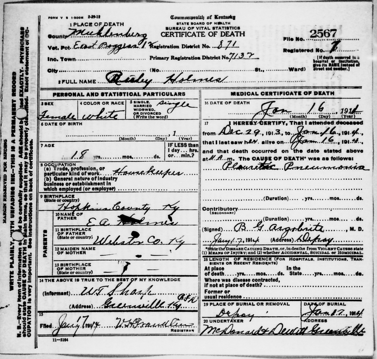 Kentucky Death Certificate 2567.
