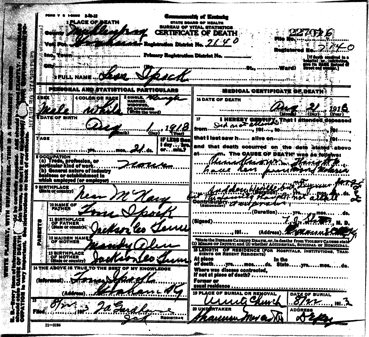 - Ipock, Less (1913 - 1913) Kentucky Death Certificate 22704.