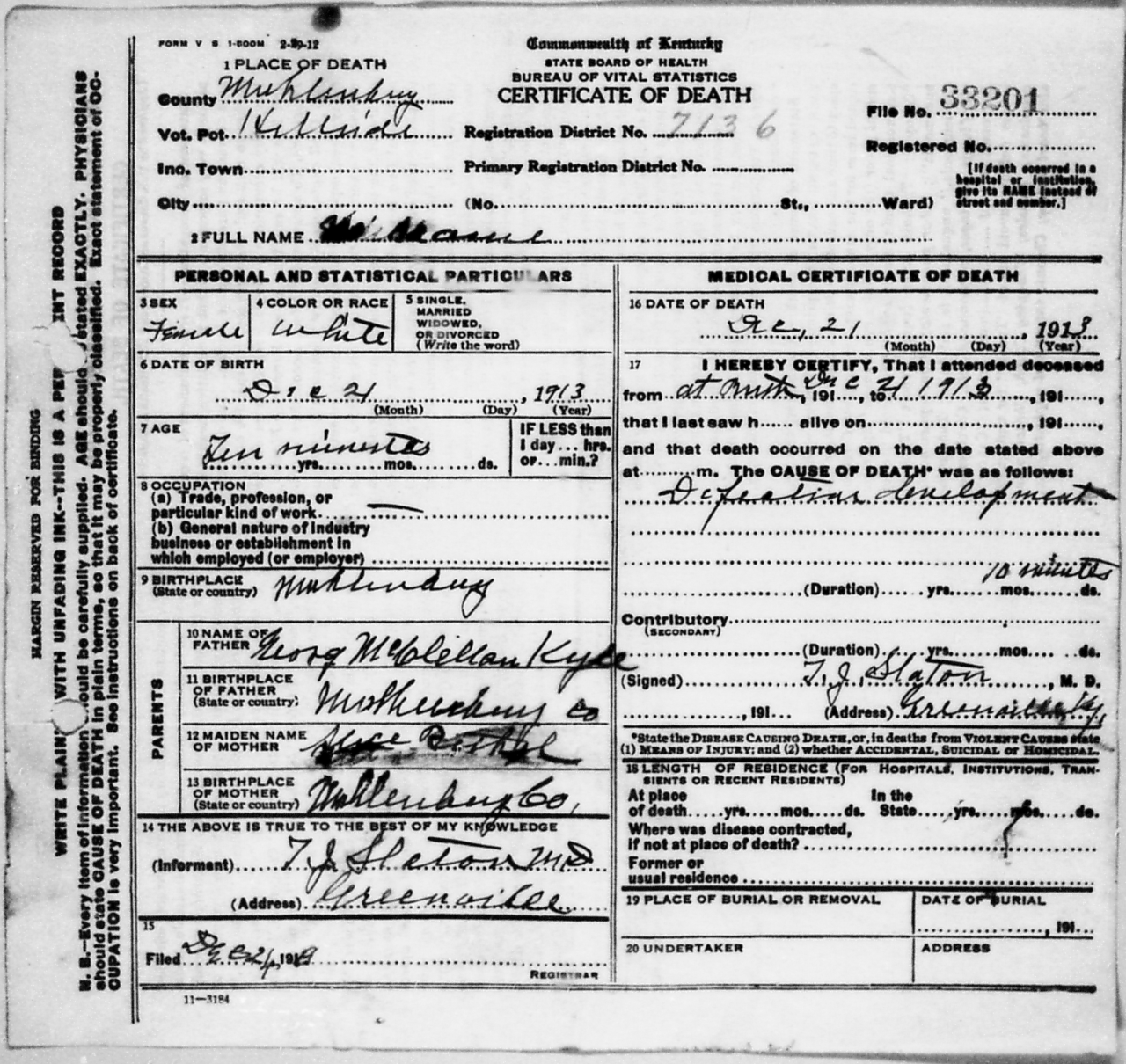 - Kyle, unnamed (1913 - 1913) Kentucky Death Certificate 33201.